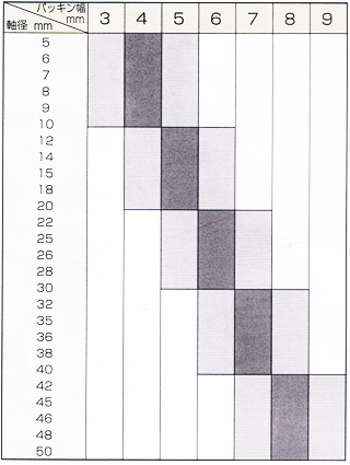 | 軸径とパッキン幅 | パッキン幅と高さ | ||||||||||||||||||||||||||||||||||||